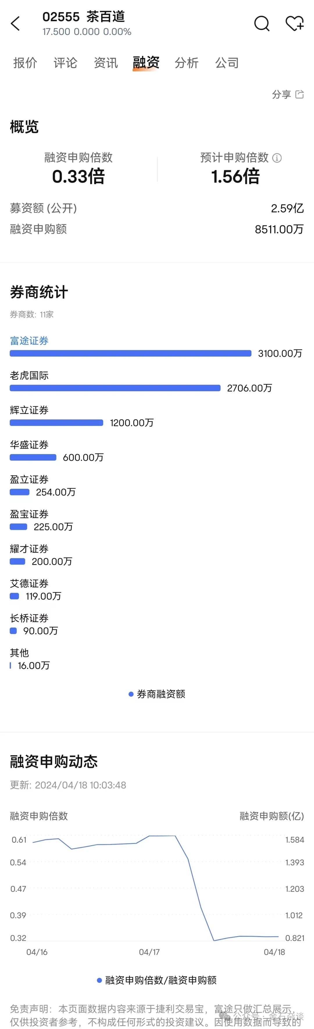 现在招股还是末端,拟募资25.9亿,不外孖展认购只好0.33倍,预测申购1.56倍。不仅孖展认购不及,还出现抽飞情况,融资倍数一度达到0.61倍,4月17日募资额大幅缩水,少了险些一半。