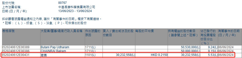 智通财经APP获悉世博体育,香港联交所最新贵府清晰,6月6日,严震增握中基龟龄科学(00767)3023.2558万股,每股作价为0.215港元,总金额约为650万港元。增握后最新握股数量划分约为3023.26万股世博体育,最新握股比例为5.53%。