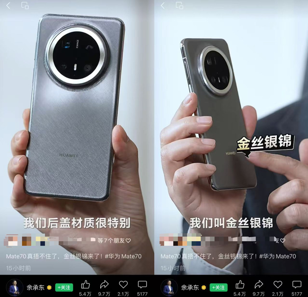 昨日,华为常务董事余承东厚爱入驻微信视频号。他在视频中晒出了华为Mate 70 Pro+真机,并格外展示了该款手机后盖的材质。
