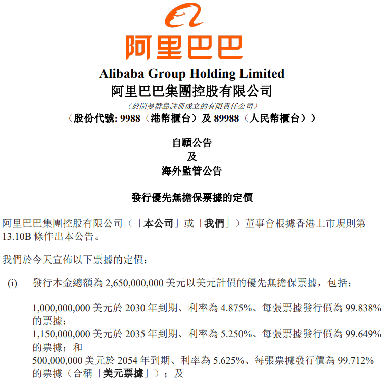 阿里巴巴拟刊行26.5亿好意思元和170亿东说念主民币债券