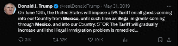 注:2019年5月31日,特朗普在推特上晓示对墨西哥输好意思商品征收5%关税