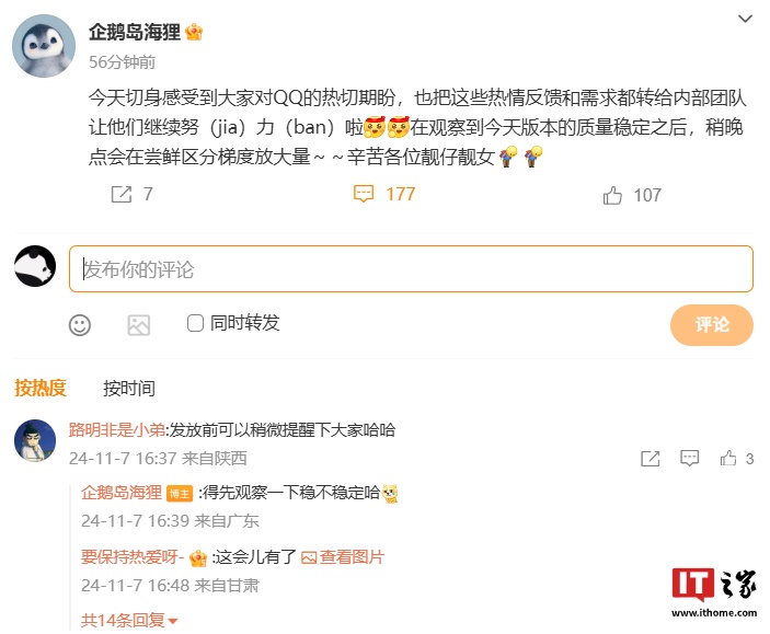 IT之家 11 月 7 日音讯,腾讯公关 @企鹅岛海狸 当天发文称,感受到用户对纯血鸿蒙版 QQ 欺骗的温雅,在不雅察到今天版块的质料稳固之后,稍误点会在尝鲜离别梯度放多数。